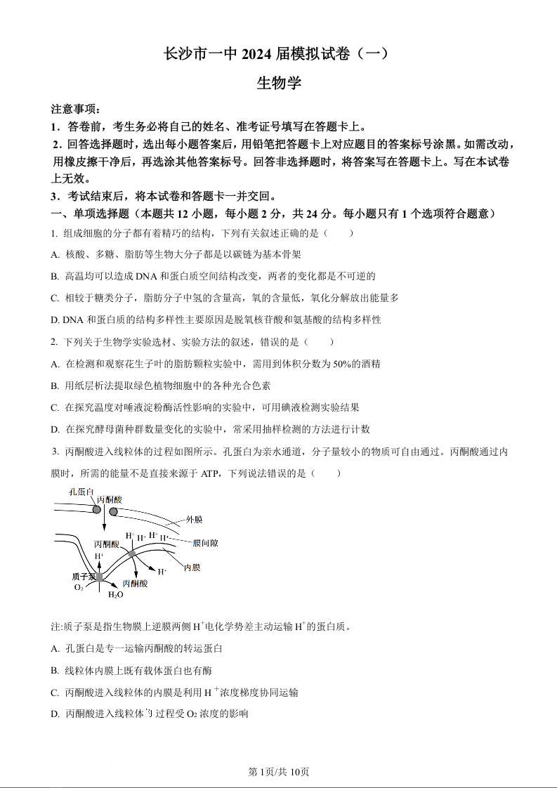 湖南省长沙市第一中学2024届高三模拟考试(一)生物(原卷版)