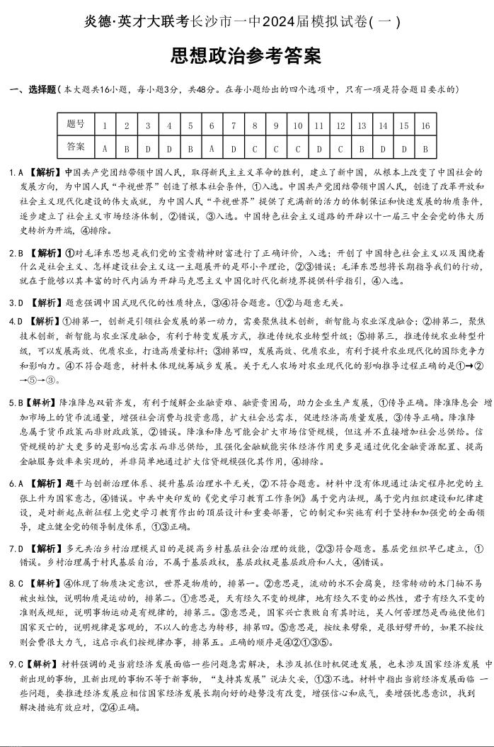 湖南省长沙市第一中学2024届高三模拟考试(一)政治答案