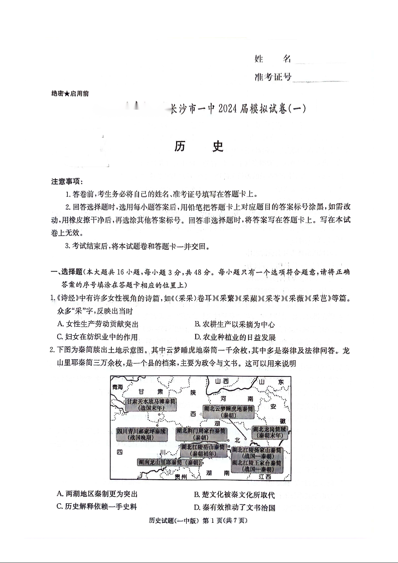 湖南省长沙市第一中学2024届高三模拟考试(一)历史