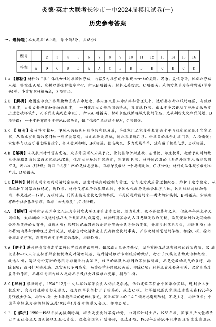 湖南省长沙市第一中学2024届高三模拟考试(一)历史答案