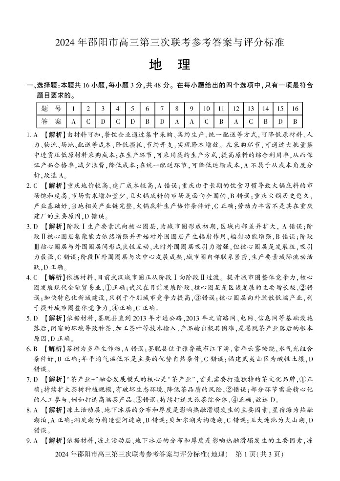 湖南省邵阳市2024届高三第三次联考地理答案