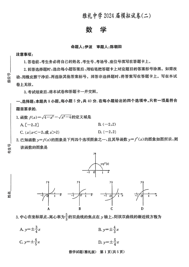 湖南省雅礼中学2024届高三下学期模拟考(二)数学