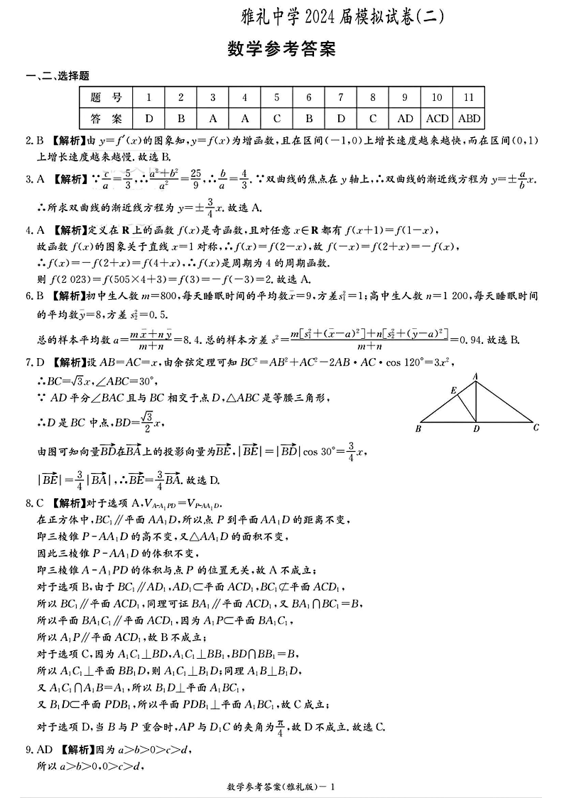 湖南省雅礼中学2024届高三下学期模拟考(二)数学答案