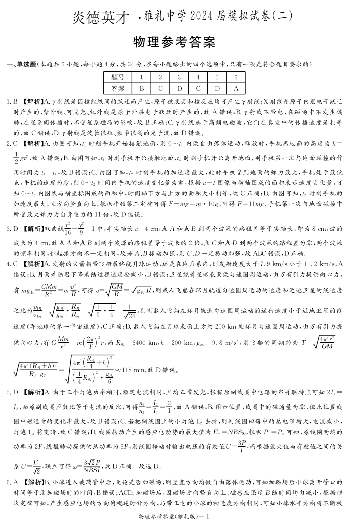 湖南省雅礼中学2024届高三下学期模拟考(二)物理答案
