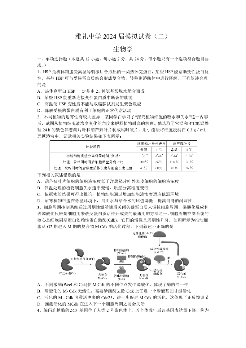 湖南省雅礼中学2024届高三下学期模拟考(二)生物