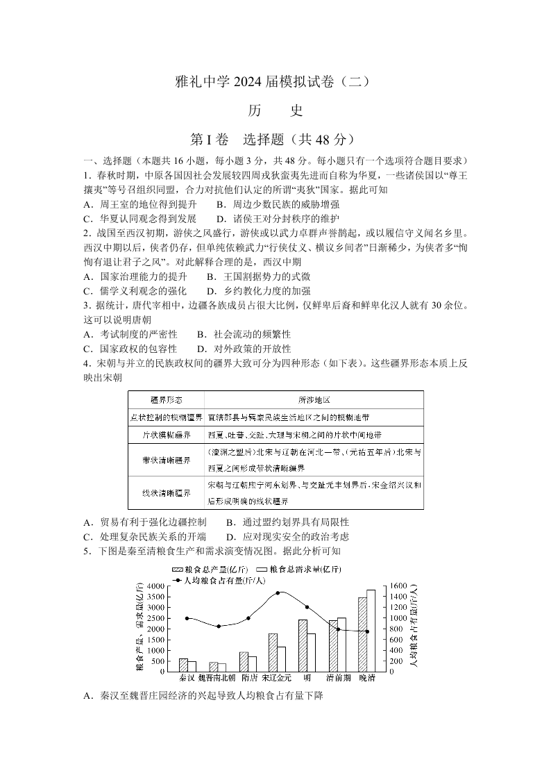 湖南省雅礼中学2024届高三下学期模拟考(二)历史+答案