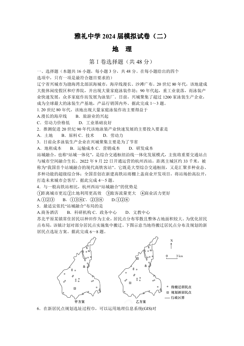 湖南省雅礼中学2024届高三下学期模拟考(二)地理+答案