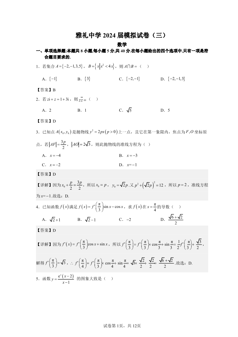 湖南省雅礼中学2024届高三下学期模拟考(三)数学(精品解析版)