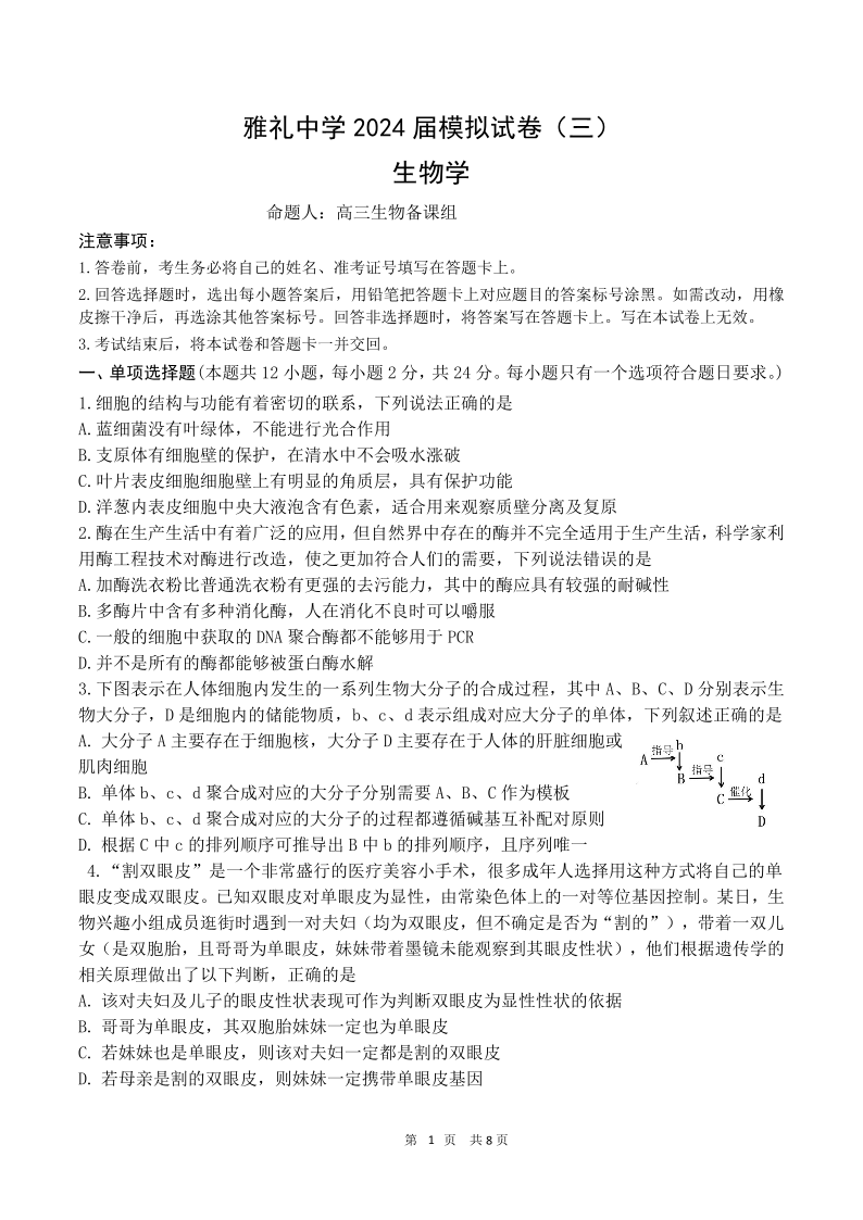 湖南省雅礼中学2024届高三下学期模拟考(三)生物