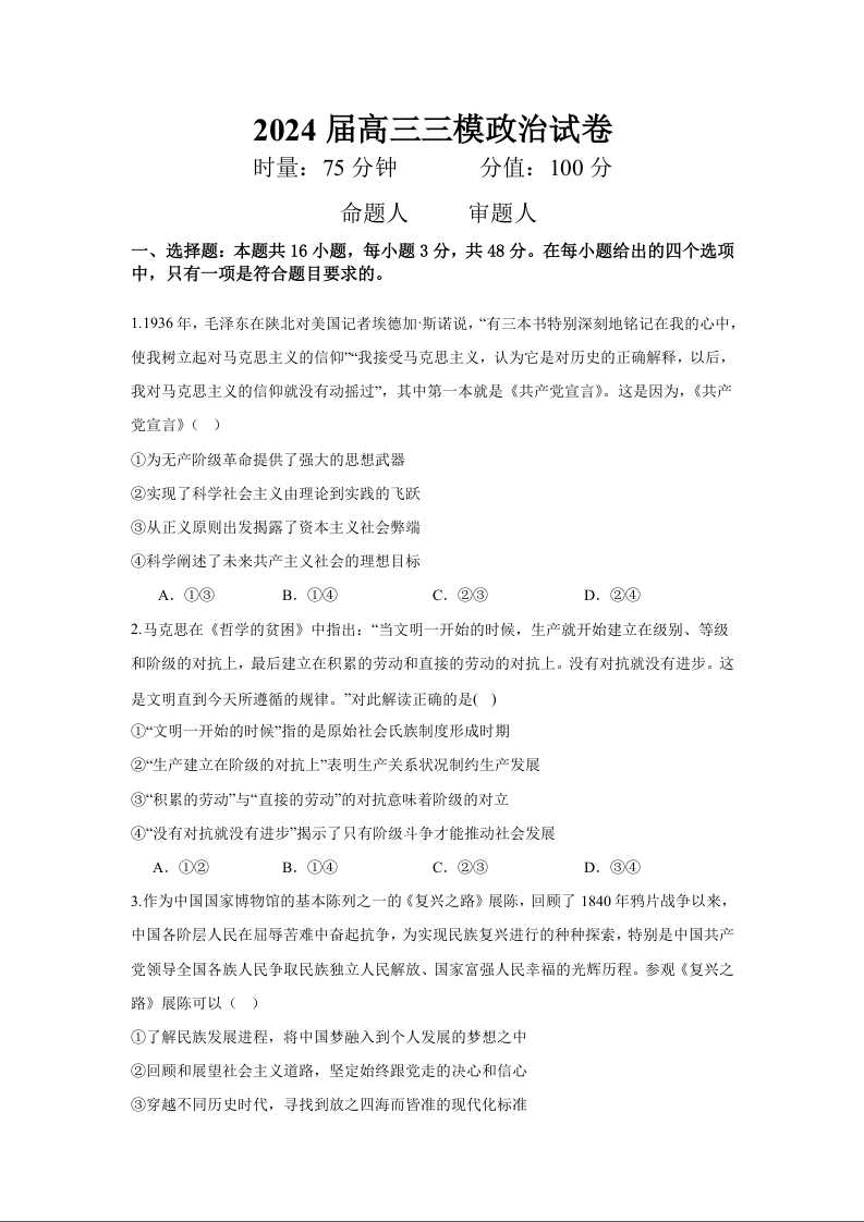 湖南省雅礼中学2024届高三下学期模拟考(三)政治(原卷版)