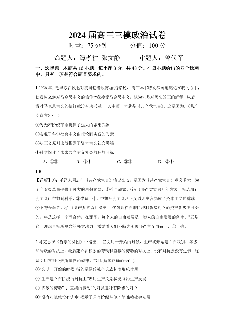 湖南省雅礼中学2024届高三下学期模拟考(三)政治(精品解析版)