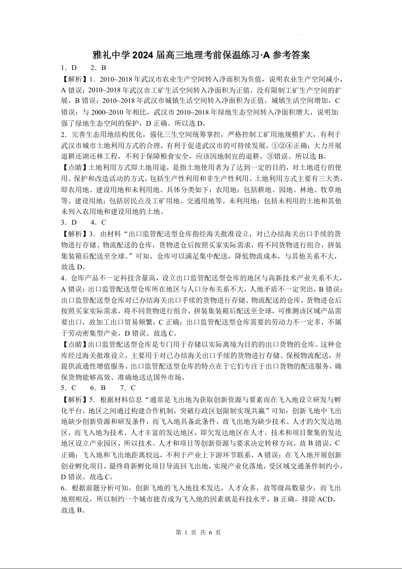 湖南省雅礼中学2024届高三下学期模拟考(三)地理答案