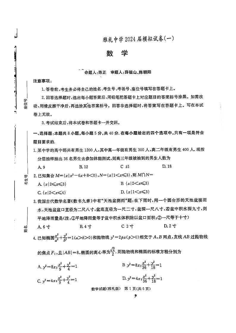 湖南省雅礼中学2024届高三下学期模拟考(一)数学