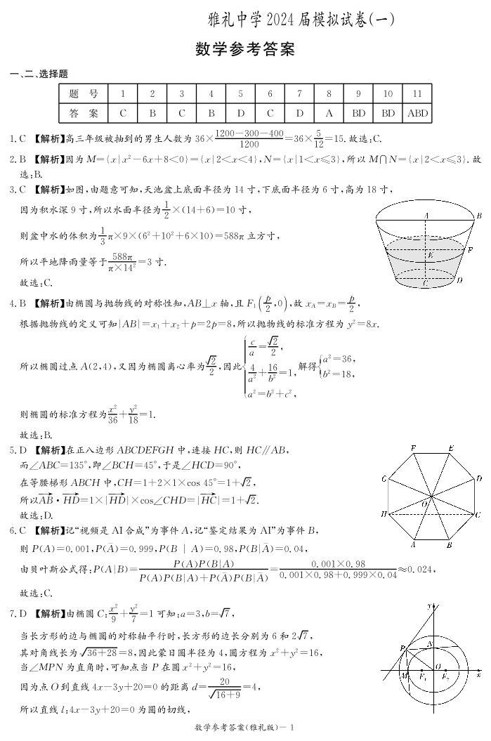 湖南省雅礼中学2024届高三下学期模拟考(一)数学答案