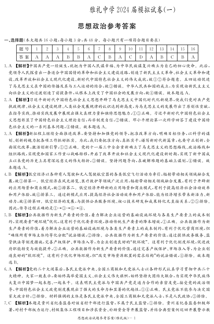 湖南省雅礼中学2024届高三下学期模拟考(一)政治答案