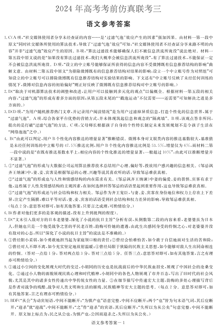 湖南省炎德2024届高三5月考前仿真联考(三)语文答案