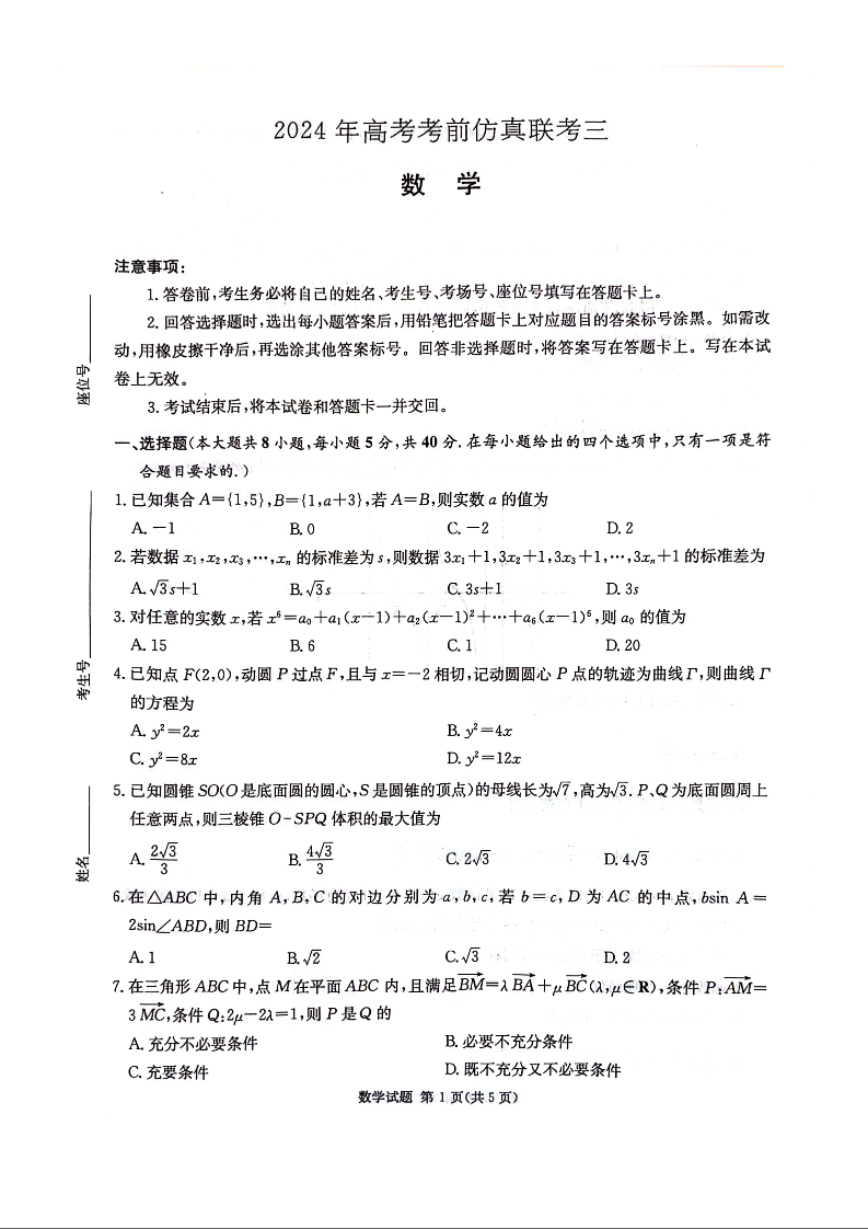 湖南省炎德2024届高三5月考前仿真联考(三)数学