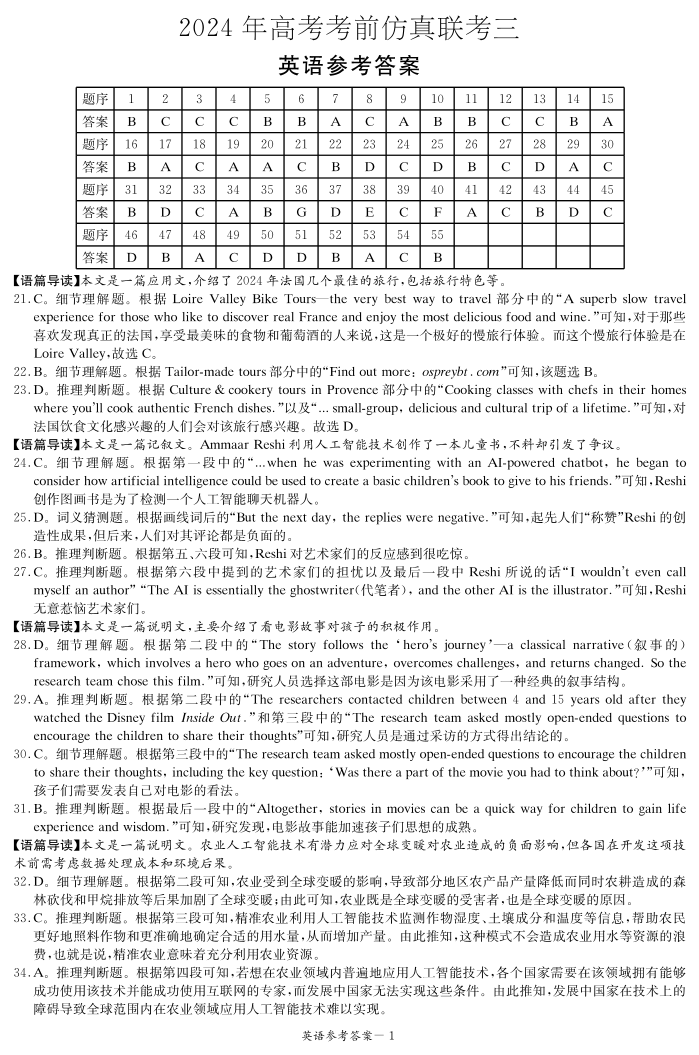 湖南省炎德2024届高三5月考前仿真联考(三)英语答案