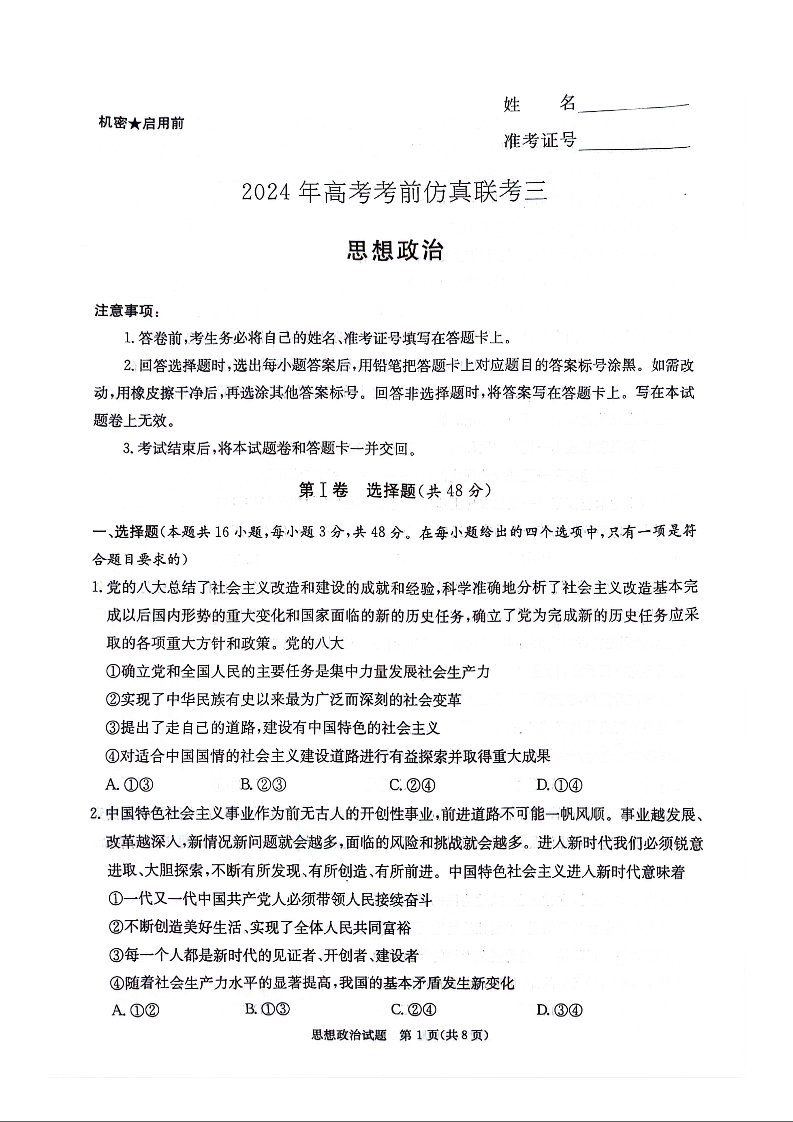 湖南省炎德2024届高三5月考前仿真联考(三)政治