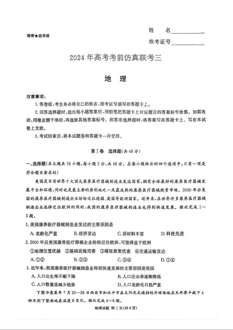 湖南省炎德2024届高三5月考前仿真联考(三)地理