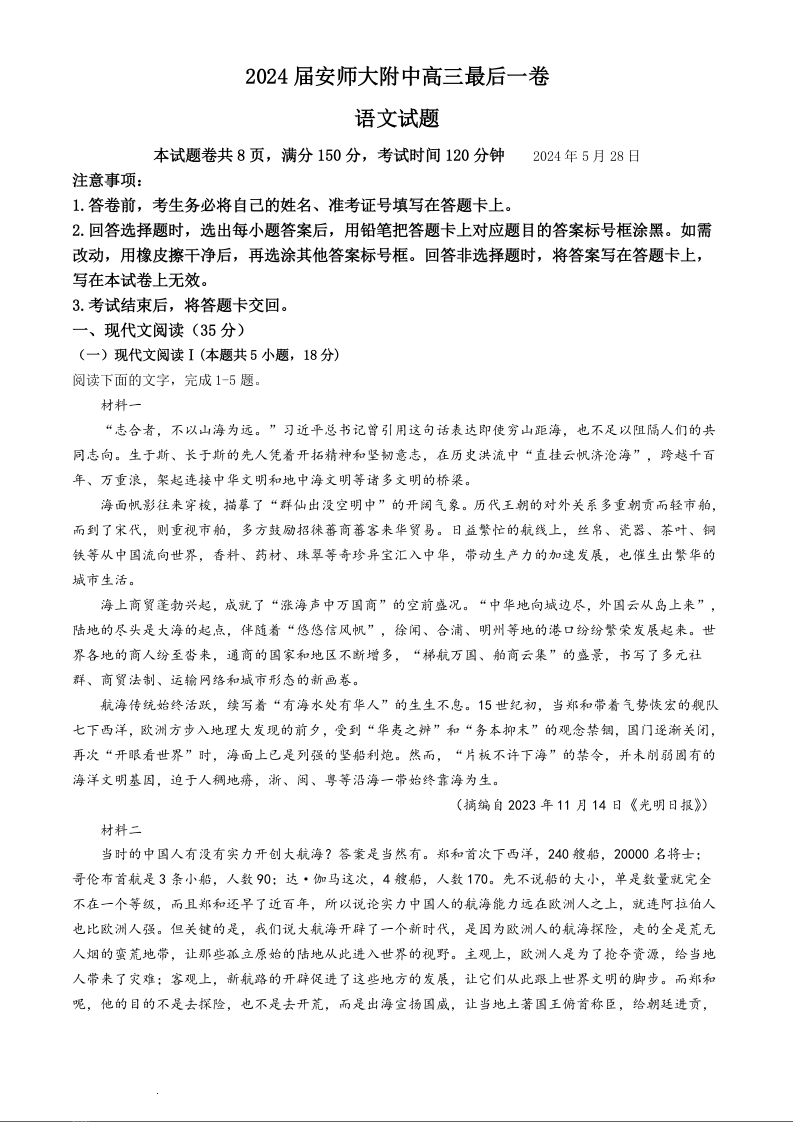 安徽师范大学附属中学2024届高三下学期最后一卷(三模)语文+答案
