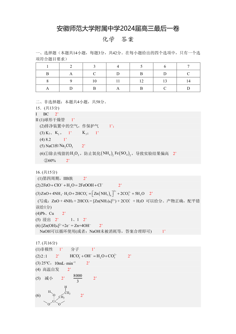 安徽师范大学附属中学2024届高三下学期最后一卷(三模)化学答案