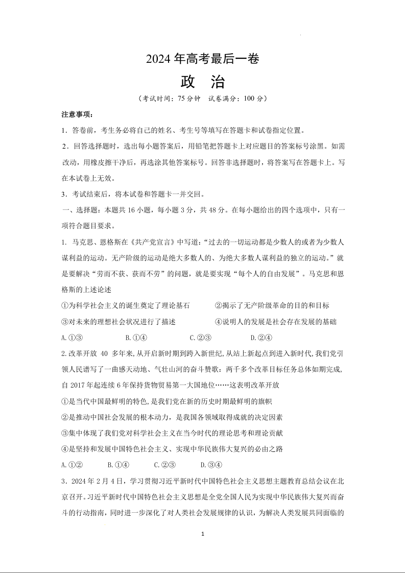 安徽师范大学附属中学2024届高三下学期最后一卷(三模)政治+答案