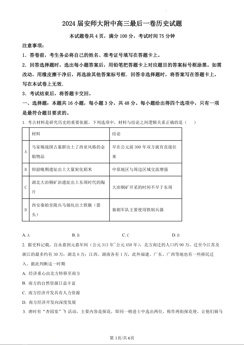 安徽师范大学附属中学2024届高三下学期最后一卷(三模)历史(原卷版)