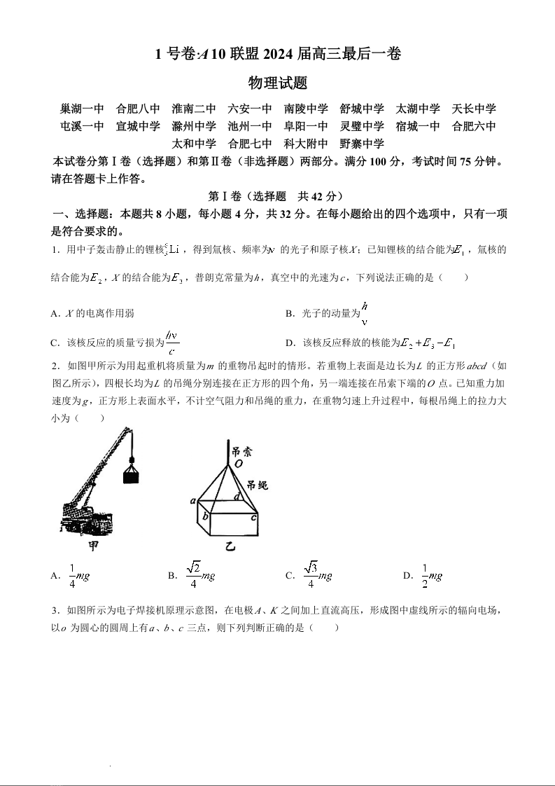 安徽省1号卷A10联盟2024届高三最后一卷物理+答案