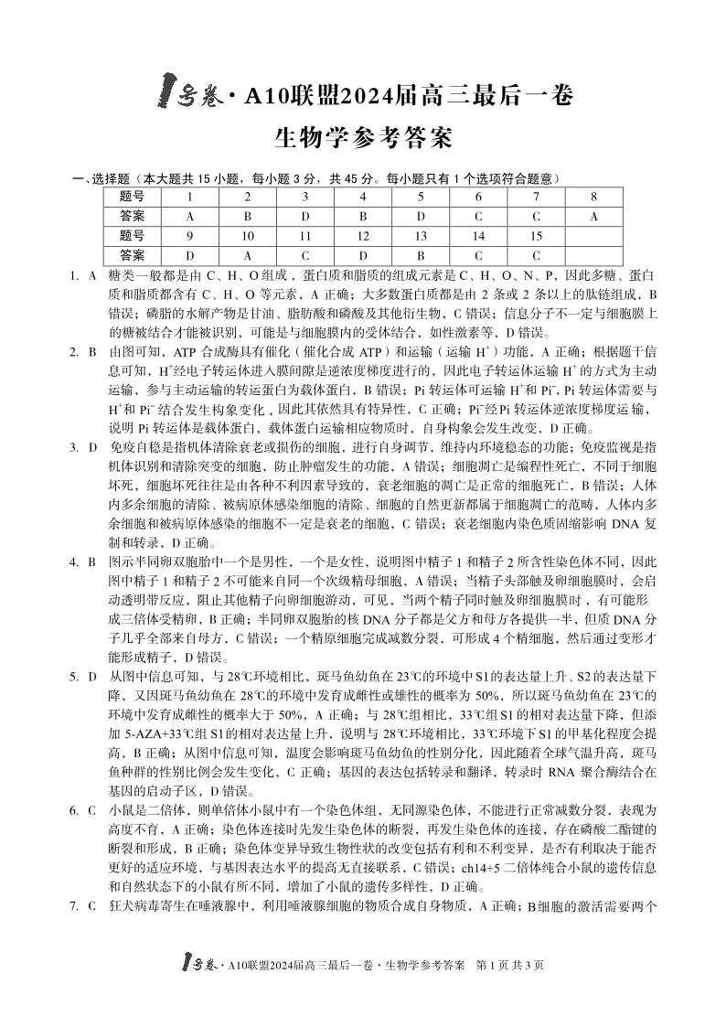安徽省1号卷A10联盟2024届高三最后一卷生物答案
