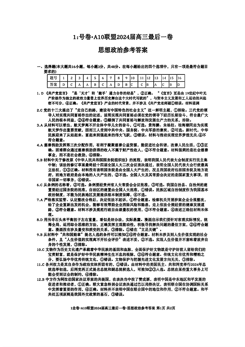 安徽省1号卷A10联盟2024届高三最后一卷政治答案