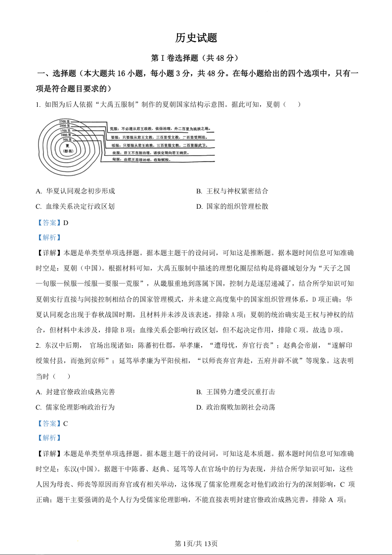 安徽省1号卷A10联盟2024届高三最后一卷历史(精品解析版)