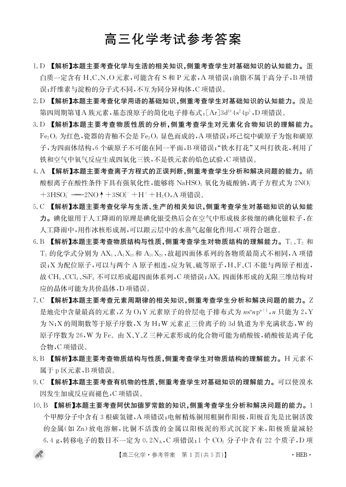 河北省保定市九校2024届高三下学期二模化学答案