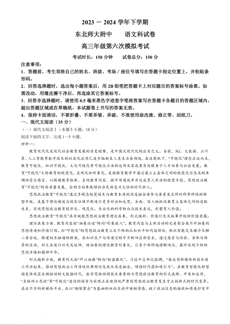 吉林省长春市东北师范大学附属中学2024届高三下学期第六次模拟考试语文