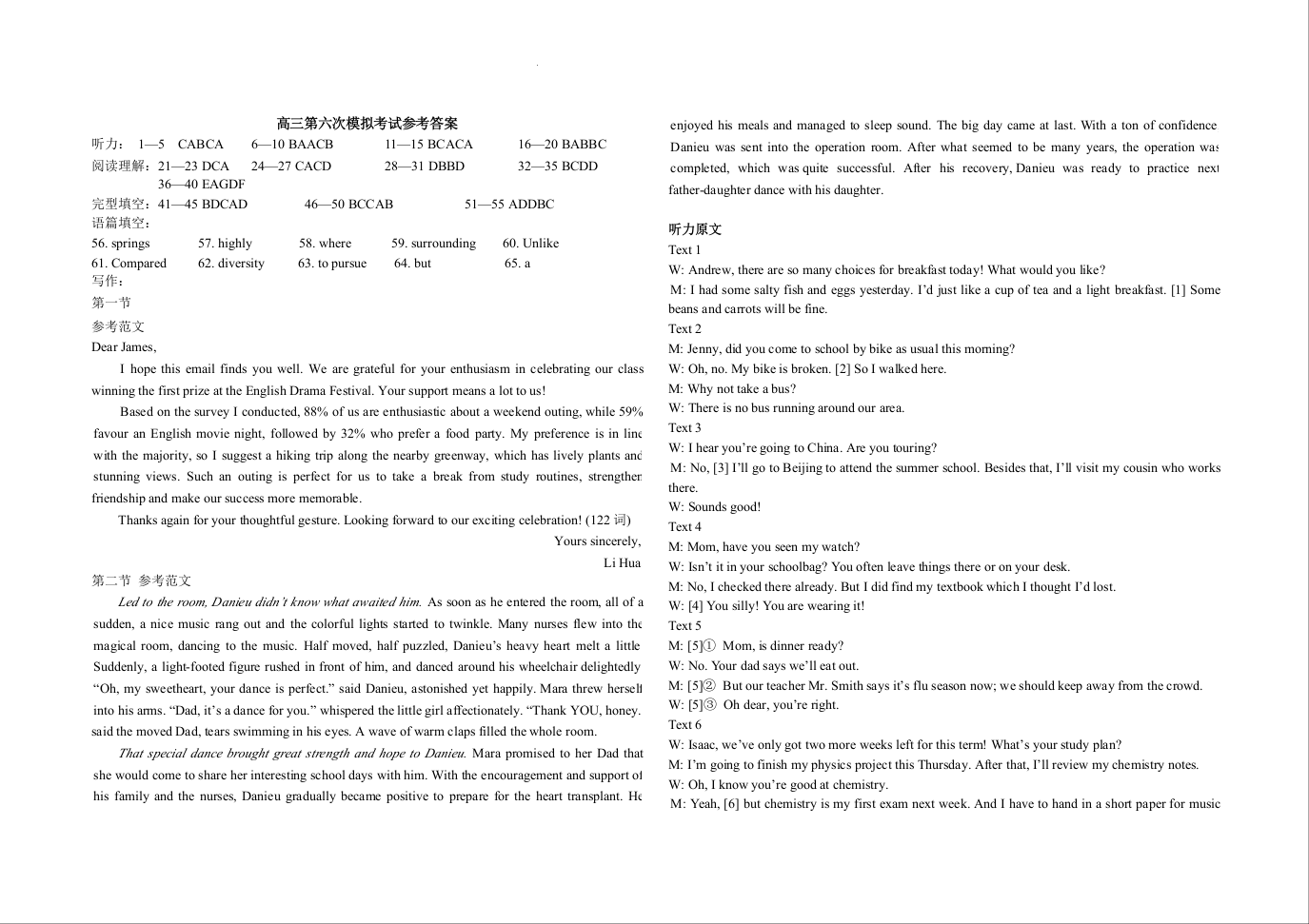 吉林省长春市东北师范大学附属中学2024届高三下学期第六次模拟考试英语答案