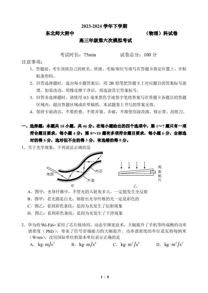吉林省长春市东北师范大学附属中学2024届高三下学期第六次模拟考试物理