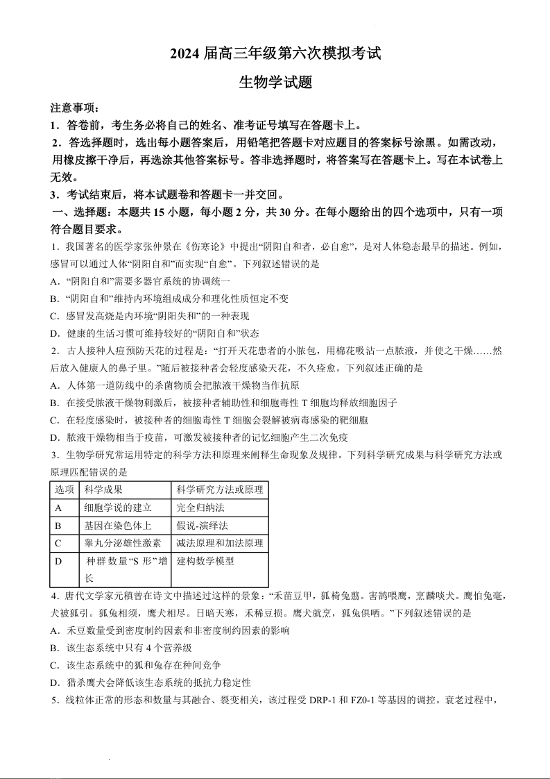 吉林省长春市东北师范大学附属中学2024届高三下学期第六次模拟考试生物