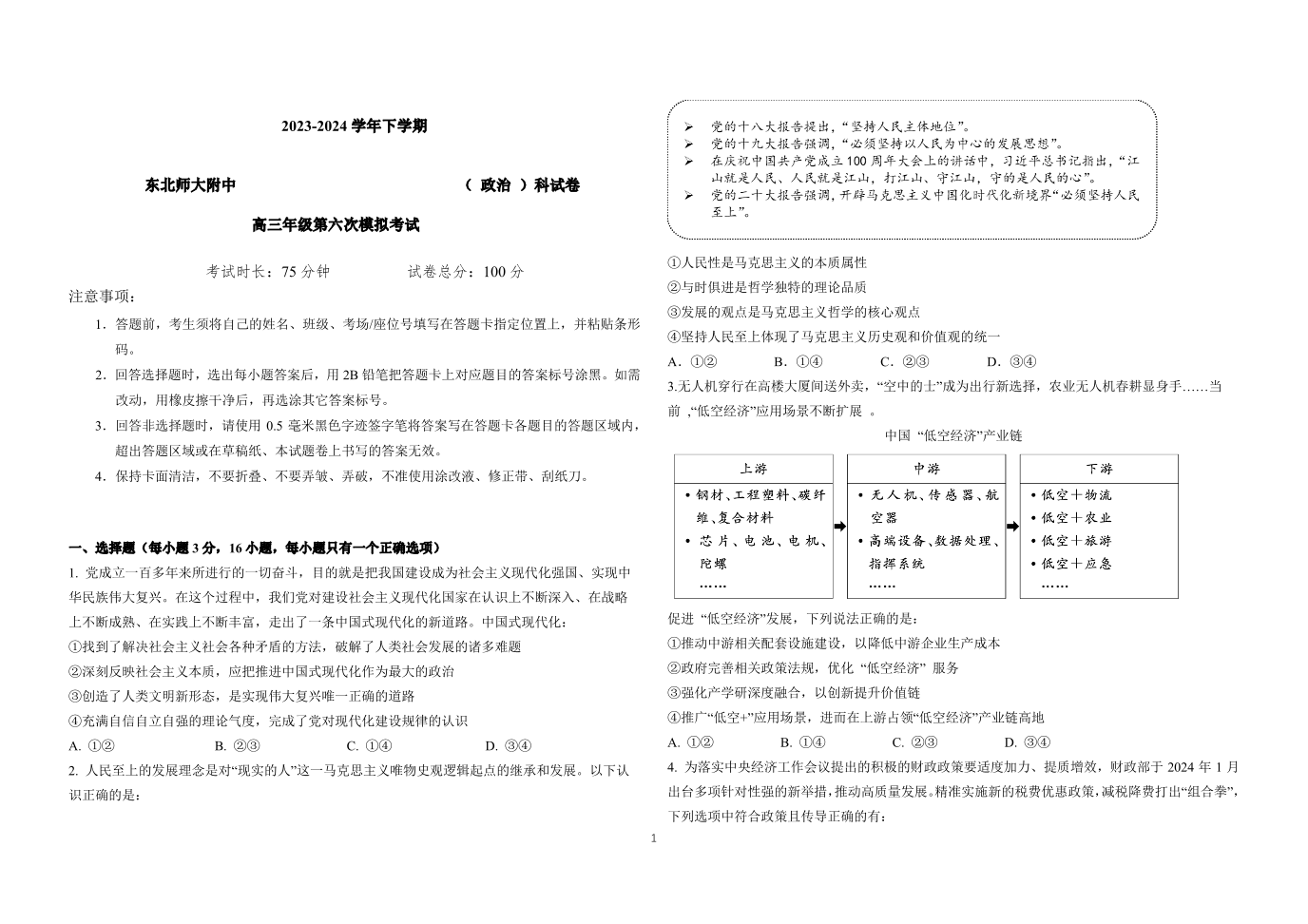 吉林省长春市东北师范大学附属中学2024届高三下学期第六次模拟考试政治