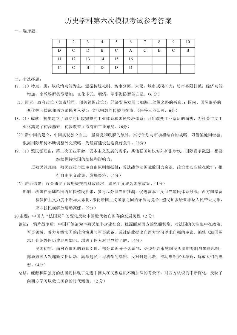 吉林省长春市东北师范大学附属中学2024届高三下学期第六次模拟考试历史答案