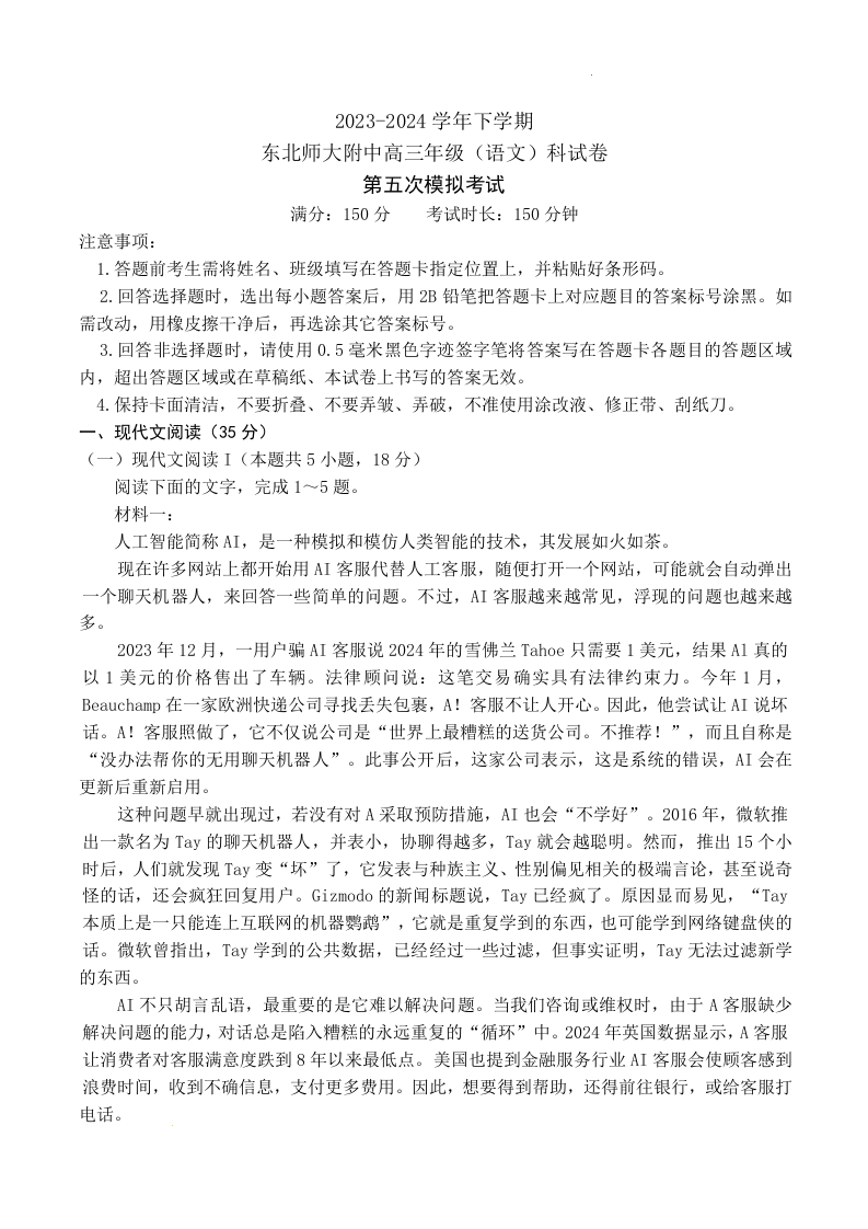 吉林省长春市东北师范大学附属中学2024届高三下学期第五次模拟考试语文