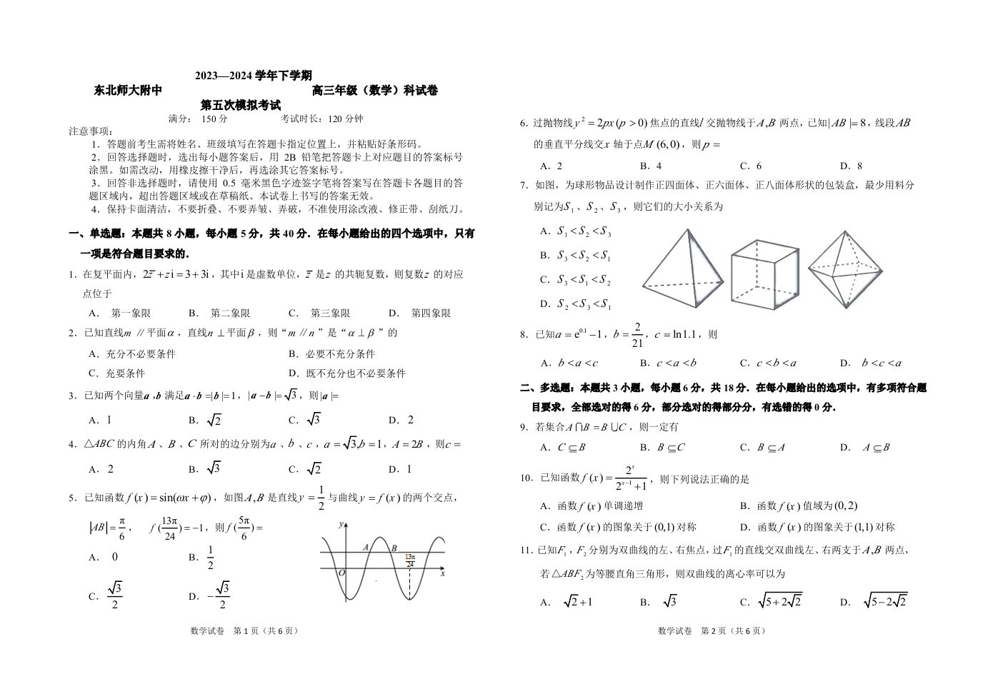 吉林省长春市东北师范大学附属中学2024届高三下学期第五次模拟考试数学
