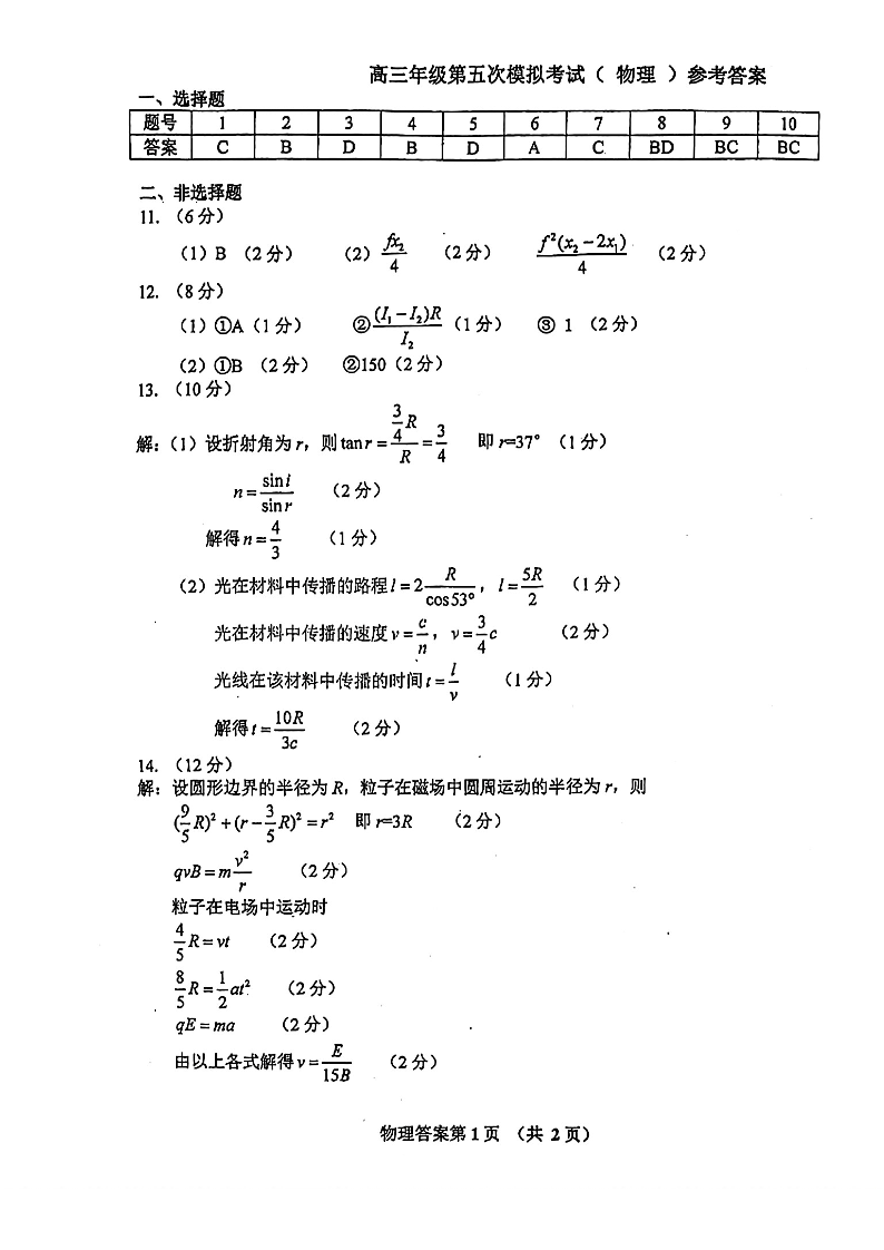 吉林省长春市东北师范大学附属中学2024届高三下学期第五次模拟考试物理答案