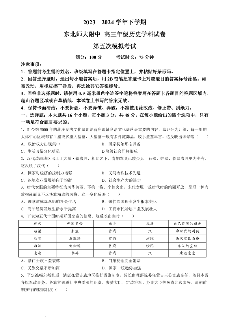 吉林省长春市东北师范大学附属中学2024届高三下学期第五次模拟考试历史+答案