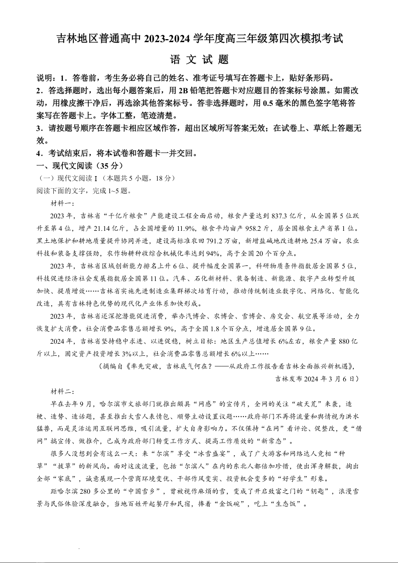 吉林省吉林市普通高中2024届高三第四次模拟考试语文+答案