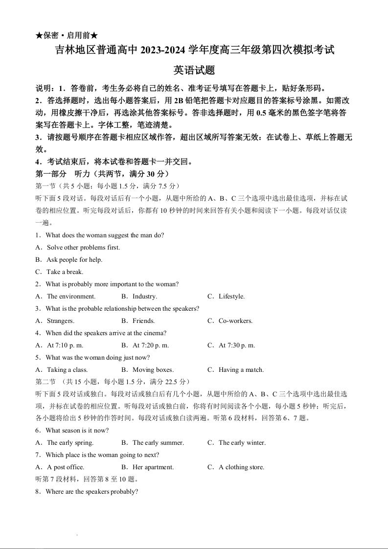 吉林省吉林市普通高中2024届高三第四次模拟考试英语