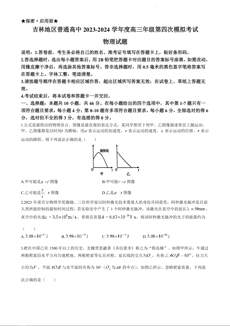 吉林省吉林市普通高中2024届高三第四次模拟考试物理