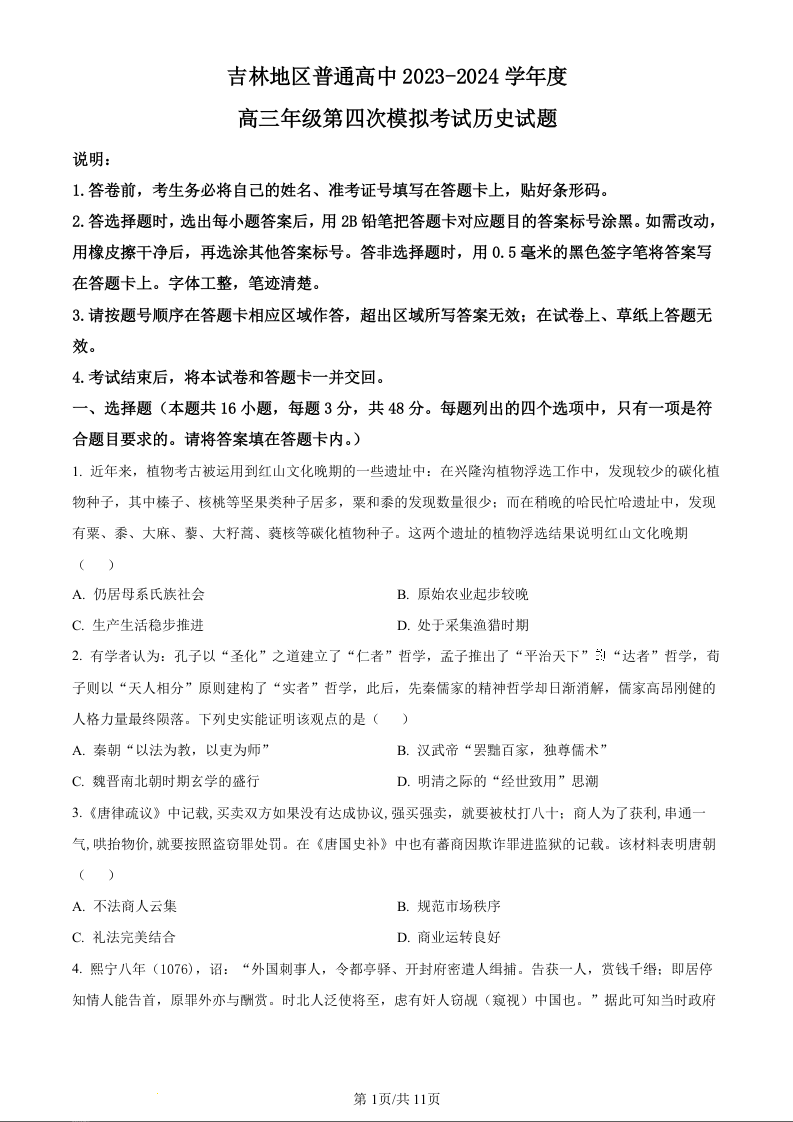 吉林省吉林市普通高中2024届高三第四次模拟考试历史+答案