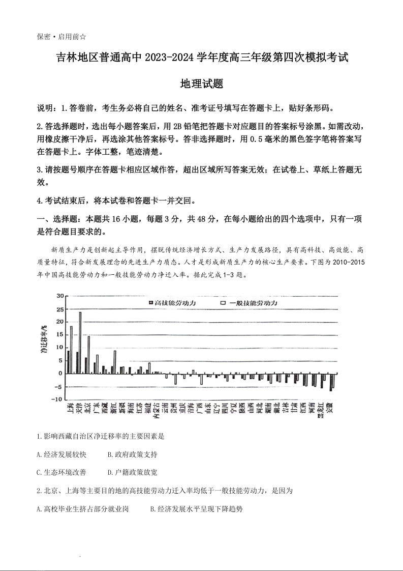 吉林省吉林市普通高中2024届高三第四次模拟考试地理