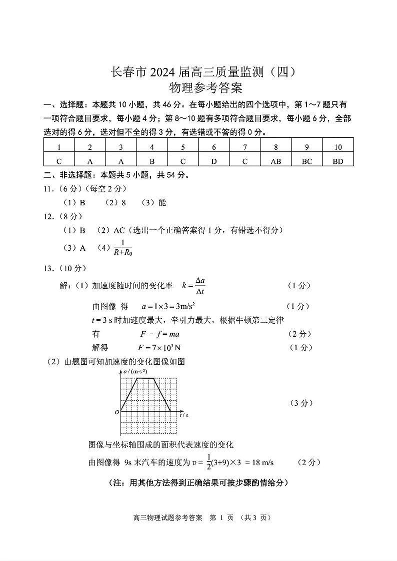 吉林省长春市2024届高三下学期四模考试物理答案