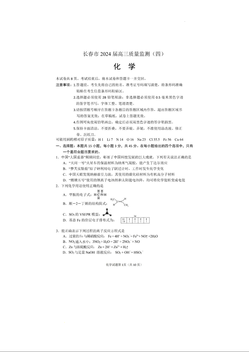 吉林省长春市2024届高三下学期四模考试化学+答案